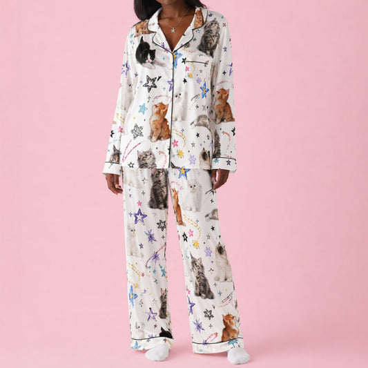 Women's Long Sleeve Pajama Top – Cat Print Button-Up Sleep Shirt