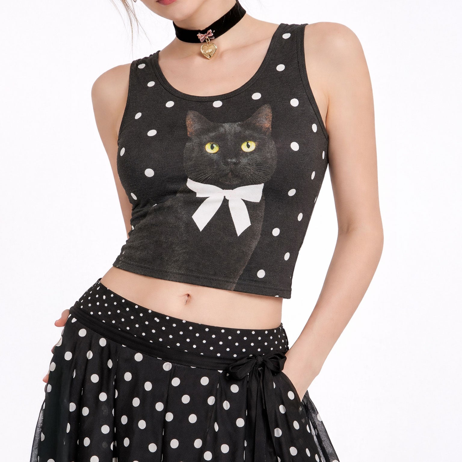A black cat staring straight forward, placed against soft polka dots and a small bow — simple, but slightly eerie the longer you look.