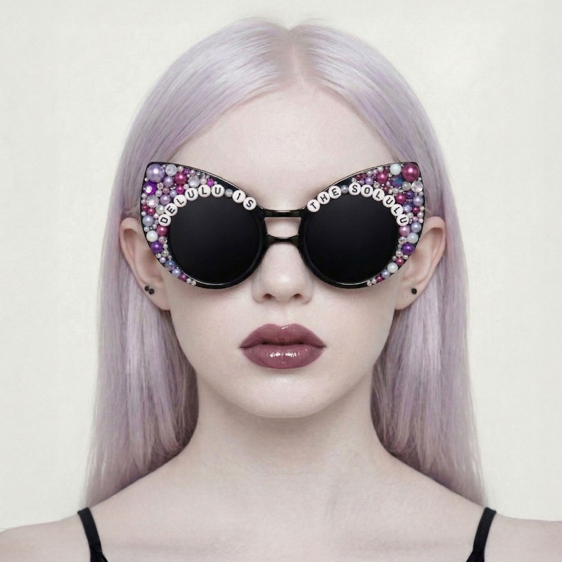 Turn your main character energy all the way up. These handmade cat-eye sunglasses are designed with bold attitude and playful chaos, featuring hand-placed rhinestones and letter beads spelling out “DELULU IS THE SOLULU.” It’s not just a phrase — it’s a mindset.